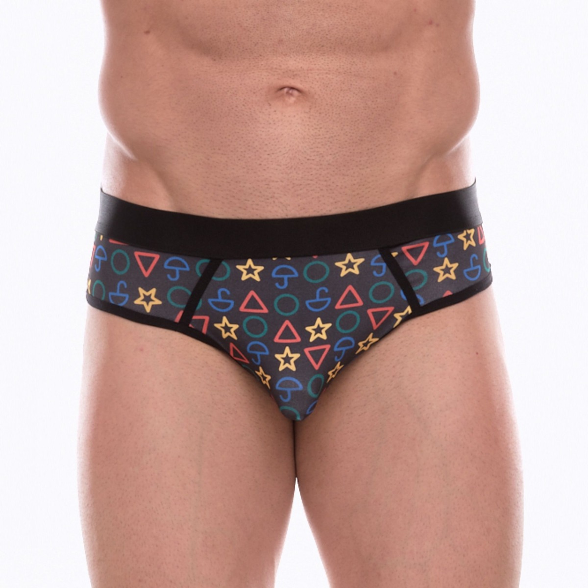 Темно-серые мужские трусы-джоки с принтом в виде цветных значков.
