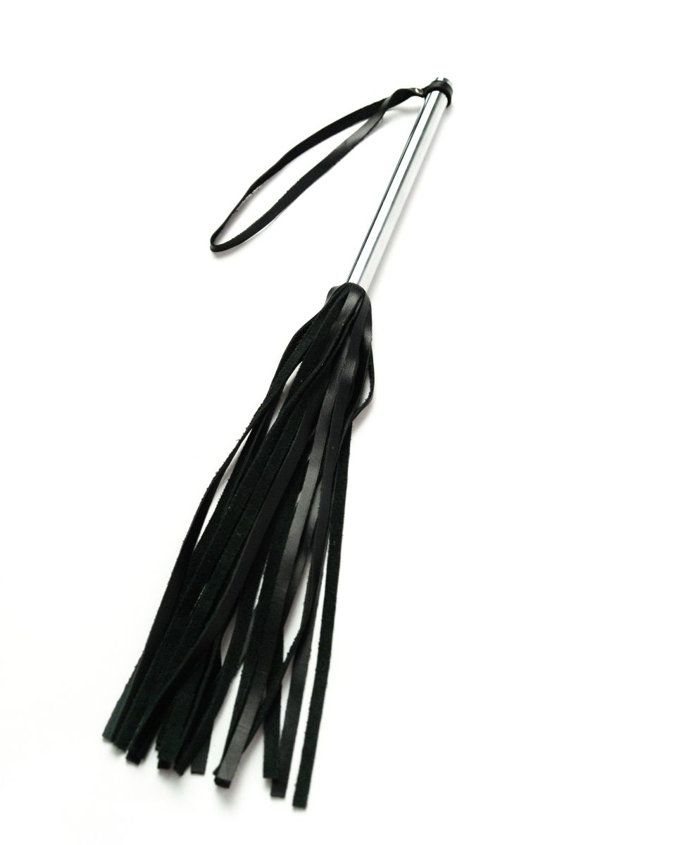 Многохвостовый флоггер с металлической рукоятью выполнен из натуральной кожи. Снабжен хромированной ручкой и удобной петлей для подвешивания.