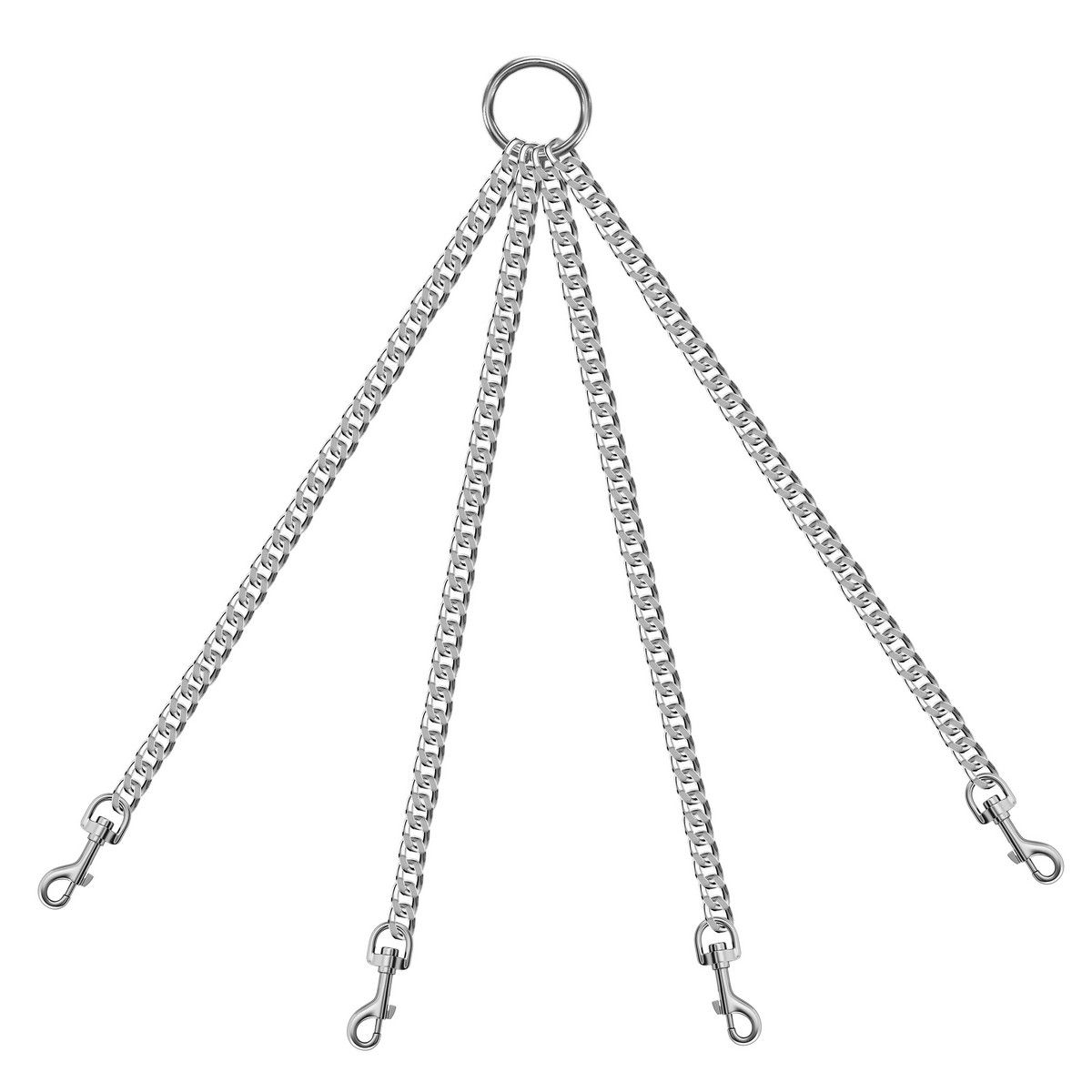 Четыре цепи с карабинами на кольце. Может использоваться для соединения наручей, поножей, также ошейника с наручами, поножами и т.д. Рабочая длина одной цепочки - 35 см. Длина карабина - 5,5 см. Диаметр кольца - 4,8 см., толщина - 0,5 см.