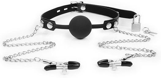 Оригинальный интимный аксессуар для любителей БДСМ-игр. Состоит из удобного ошейника с силиконовым шариком и металлических зажимов для сосков, соединённых с ошейником прочными металлическими цепочками. Также в комплект входит небольшой замочек, который придаёт дополнительный антураж. Размер ошейника можно регулировать. Внутренняя часть ремешков имеет мягкую бархатистую поверхность, предотвращающую натирание кожи. На концах зажимов предусмотрены специальные эластичные накладки, которые препятствуют сильному сдавливанию и травмированию сосков. На каждом зажиме предусмотрен регулировочный винт, позволяющий контролировать силу сдавливания. БДСМ-аксессуар прост в применении, не требуют специального ухода.