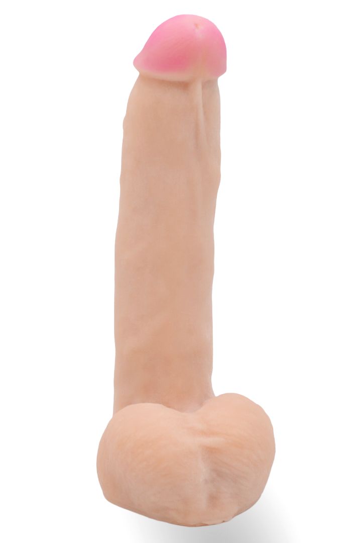 Это распространенный размер, подходящий большинству рожавших женщин. Реалистик имеет изгиб. За счет этого его можно вращать на бобышке, менять направление и даже ласкать мошонкой клитор. Имеет характеристики эрегированного мужского пениса. Рабочая длина - 17 см. Диаметр головки - 4 см.