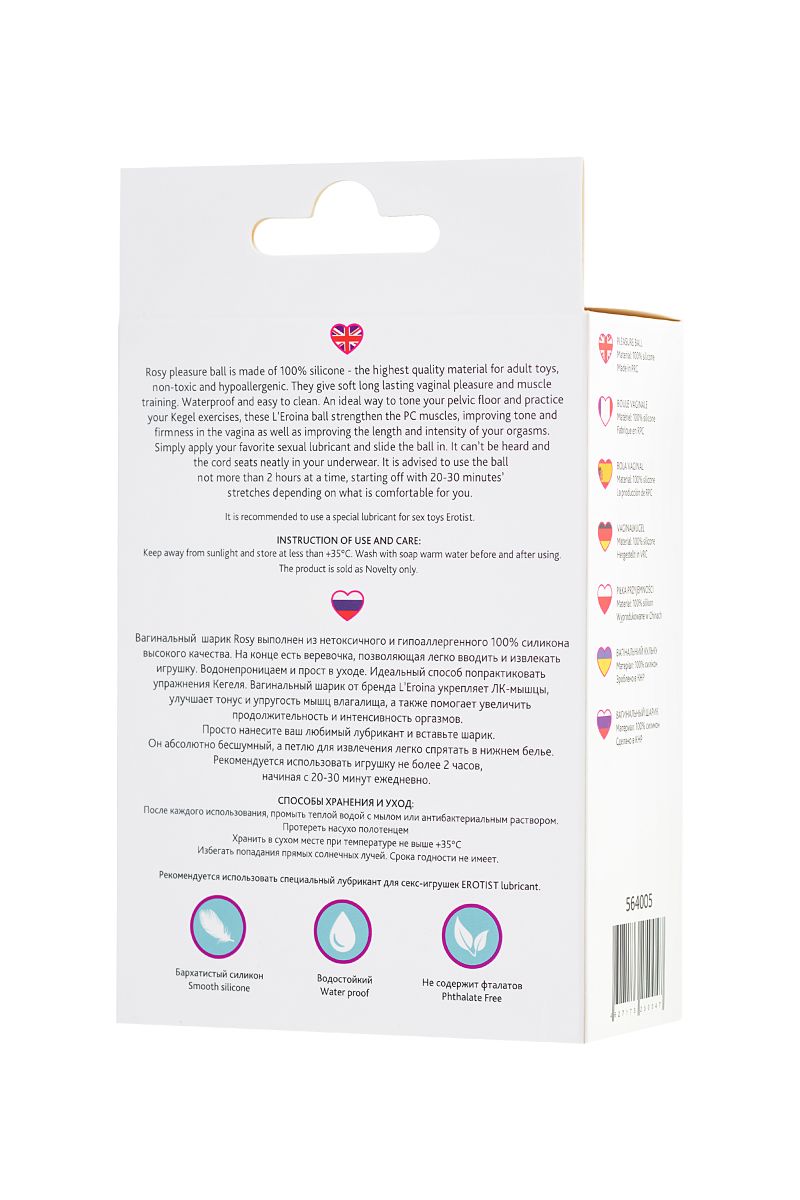 Вагинальный шарик Rosy выполнен из нетоксичного и гипоаллергенного 100% силикона высокого качества. На конце есть веревочка, позволяющая легко вводить и извлекать игрушку. Водонепроницаем и прост в уходе. Идеальный способ попрактиковать упражнения Кегеля. Вагинальный шарик от бренда L’Eroina укрепляет ЛК-мышцы, улучшает тонус и упругость мышц влагалища, а также помогает увеличить продолжительность и интенсивность оргазмов. Просто нанесите ваш любимый лубрикант и вставьте шарик. Он абсолютно бесшумный, а петлю для извлечения легко спрятать в нижнем белье. Вес - 50 гр.